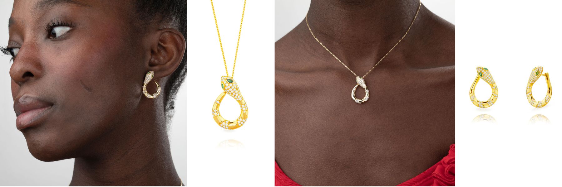 Pendientes Serpiente 27*18 mm - Circonita Verde - Bañado Oro y Plata Rodiada